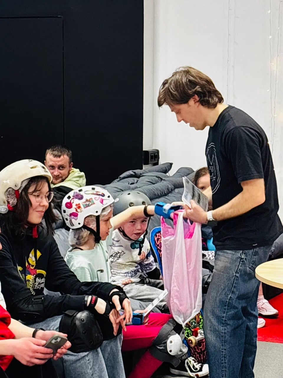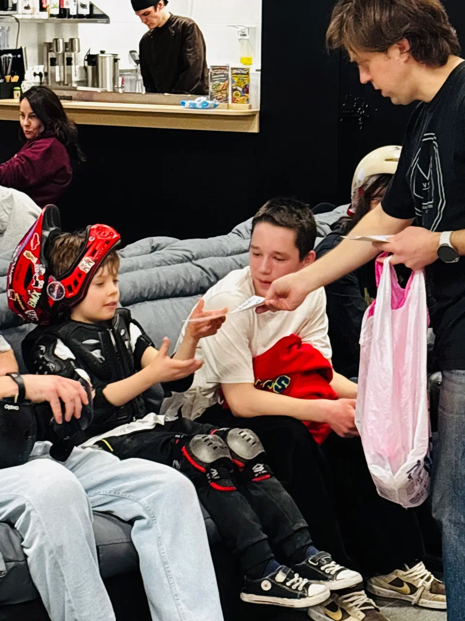 Под конец мастер класса все накатавшиеся райдеры приятно отдохнули в чилл зоне парка вместе с родителями, где подкрепились кофе, горячим шоколадом и вкусной едой!