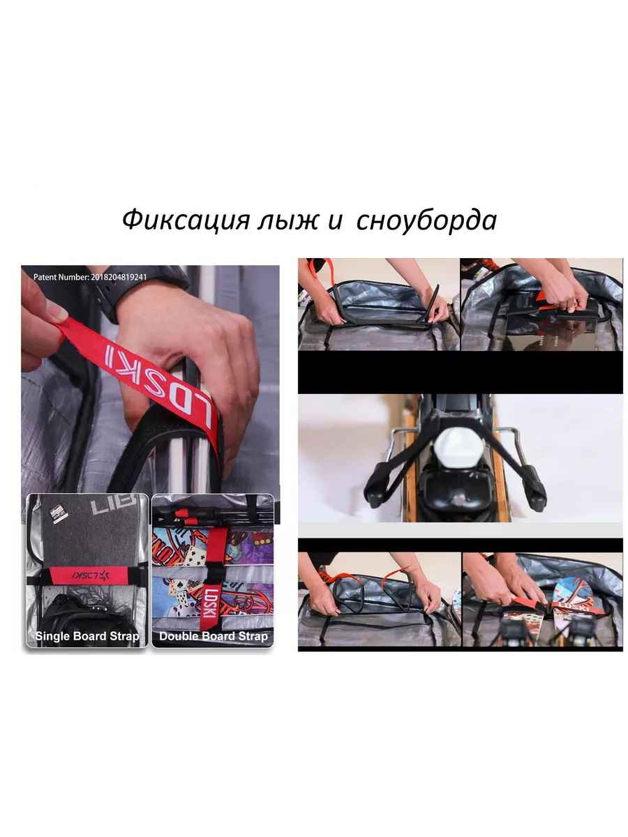 Чехол снабжен специальной системой крепежа лыж или сноуборда. Она включает: специальный набор застежек и стяжек на липучках, для надежного крепления лыж или сноуборда.