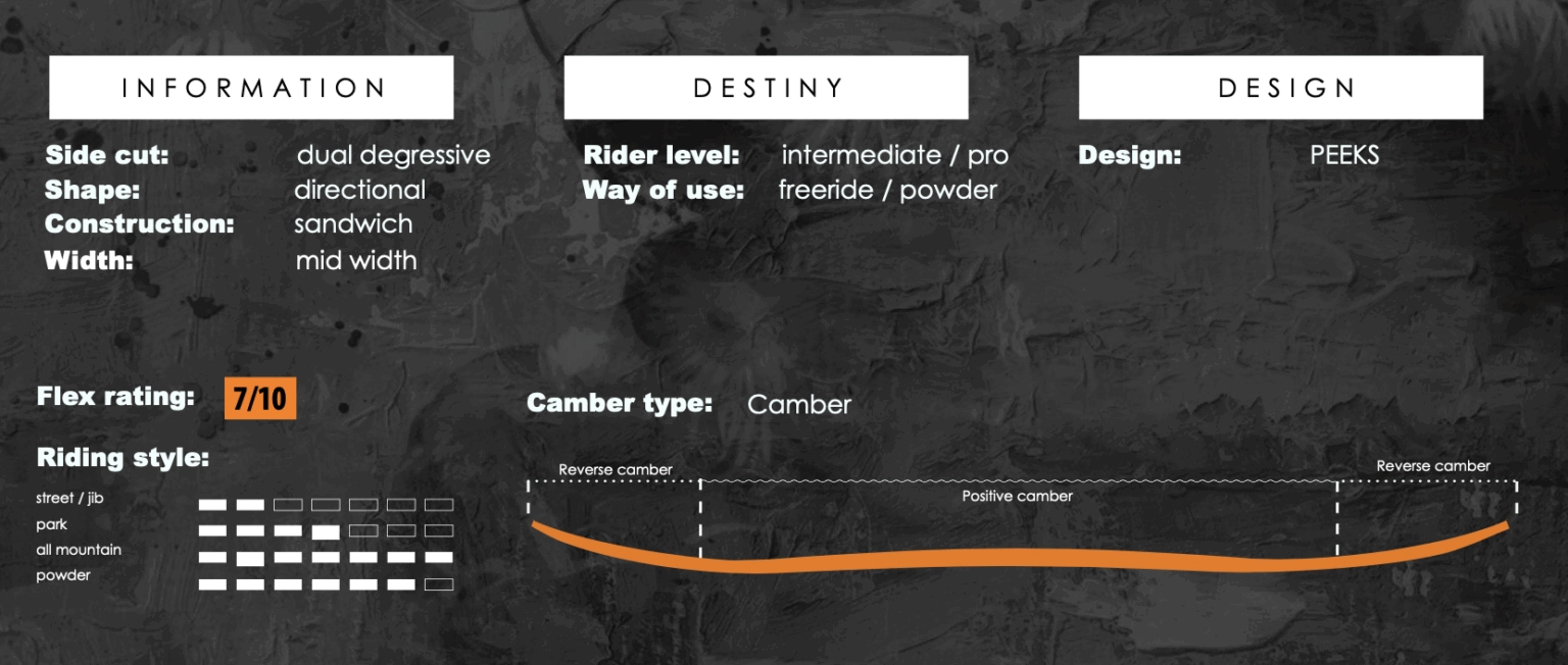 PRIMO x PEEKS – All-mountain твин тип снаряд с реверсивным прогибом. Эта доска – горючая смесь симметричного шейпа, V-образного даблкембера и цифры 7 по 10-ти бальной шкале жесткости в сочетании с технологиями ‘G-POP ®’ и Degressive Dual Sidecuts позволит проехать буквально везде, причем быстро, благодаря новому скользяку Speedster Charge. Выполнена в коллаборации с художником PEEKS.
