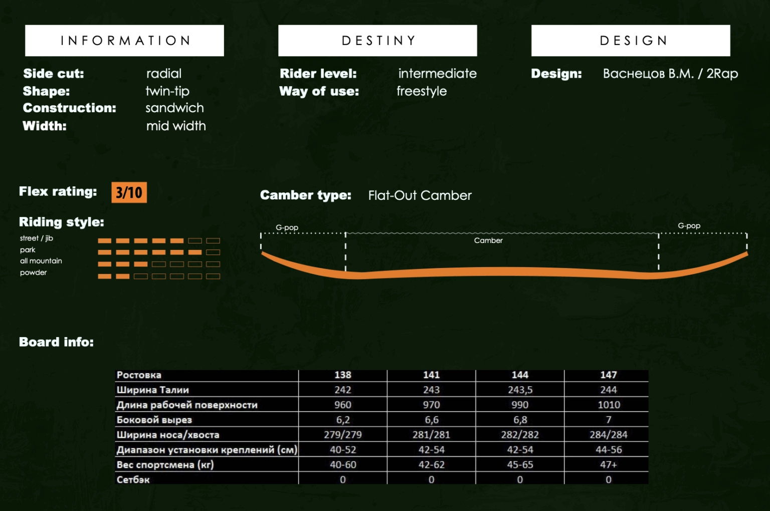 дня и достигнуть рекордных скоростей по крутым склонам. Flat-кэмбер – прогиб под ногами, предлагающий быстрый щелчок и отзывчивость, которые можно использовать для достижения самых больших характеристик в парке, не жертвуя гибкостью и прощающей степенью жесткости.